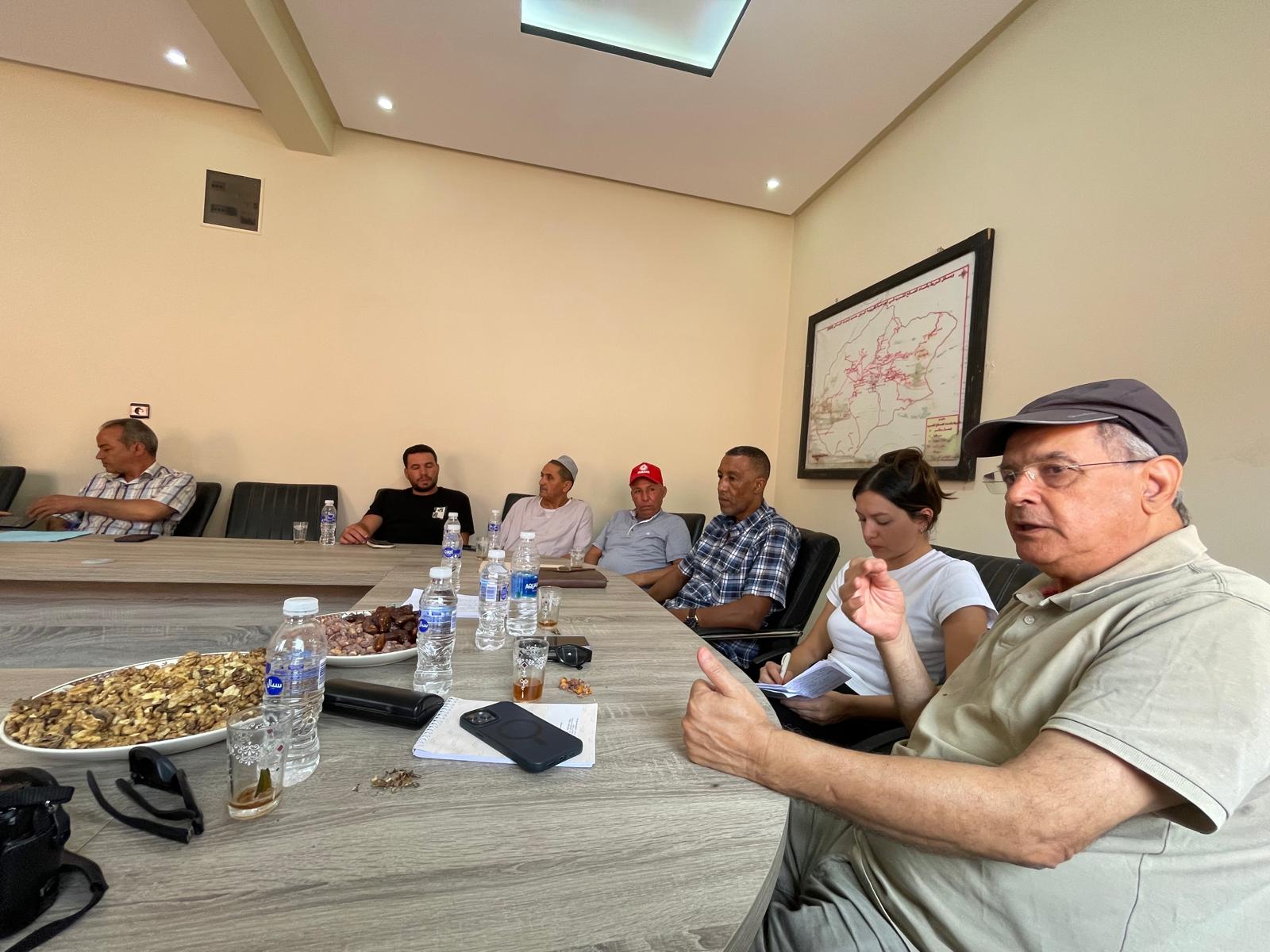 Les équipes ont commencé par une visite de terrain de la commune de l’Ouneine où elles ont pu rencontrer les associations locales et faire le bilan des activités déjà réalisées et/ou prévues, en partenariat avec Targa-Aide. Des problèmes persistants liés au stress hydrique ont été décelés lors des diagnostics préalables, donnant lieu à deux projets : la réhabilitation et l’extension du système d’assainissement du douar Toug El Kheir ; et le réaménagement de la rigole principale pour améliorer le système d’irrigation d’Adouz. Une visite complète du foyer féminin a également été effectuée, permettant aux différentes parties de réfléchir à sa reconstruction, mais également à la future gestion du foyer une fois terminé pour garantir sa pérennité, au vu de son importance pour développer le tissu associatif local et les initiatives féminines.